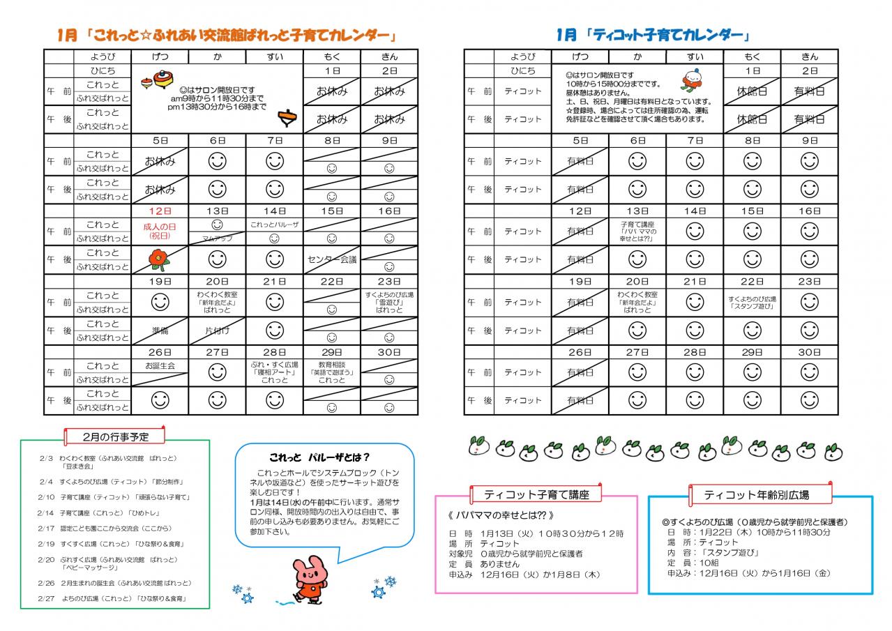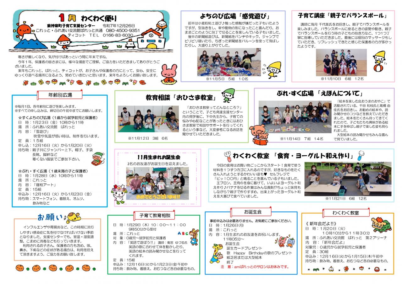 みなさんこんにちは子育て支援センターわくわく便り1月号を添付します。1月のわくわく教室では「新年会」を行います。絵馬にお願い事を書いたり、みんなでゲームを楽しむ予定です。皆様のご参加をお待ちしております。1月お便り